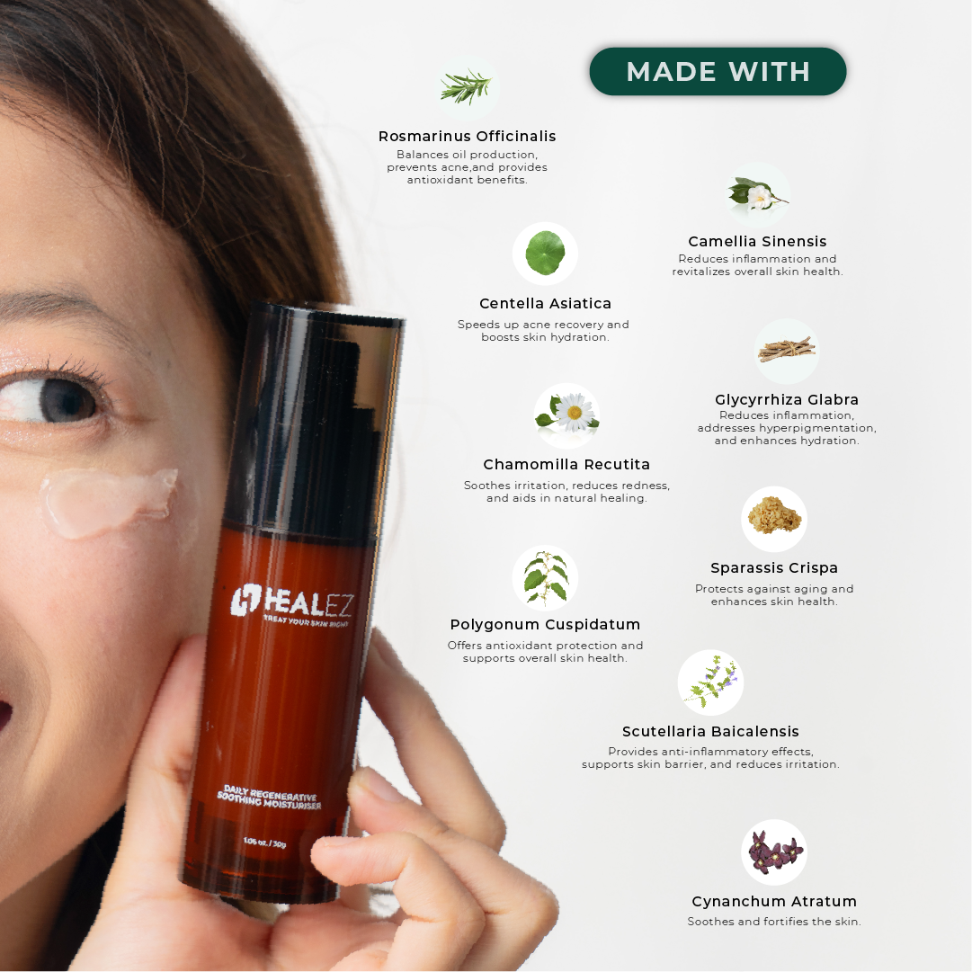 Healez Daily Regenerative Soothing Moisturiser: The ideal choice for people with sensitive skin and acne-prone skin. This gentle acne solution moisturiser soothes and efficiently reduce skin redness and itchiness, restores skin moisture, provides well-balanced treatment free of irritating chemicals.